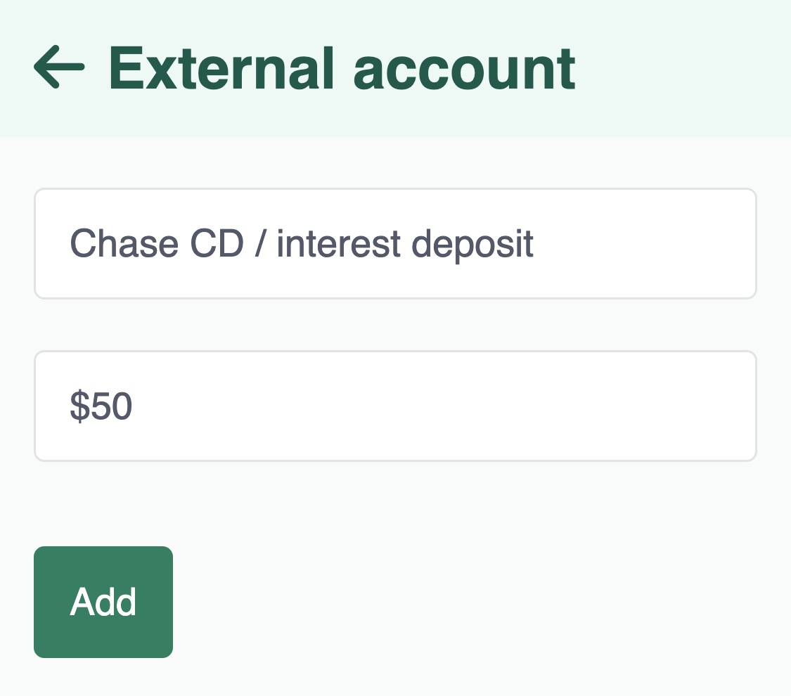 When the goal is achieved, deposit $50 into the CD account, then add an “external account” to Bomad to track the balance: