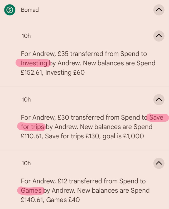 Here’s what his Bomad accounts look like. You can see the Investing, Save for trips and Games sub-accounts that were mentioned in the notifications above: